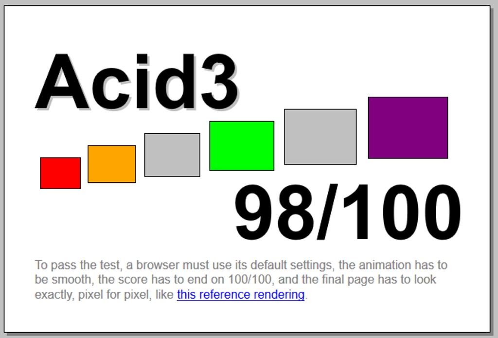 Acid3 – maximum 100 | 100 / 100 | 98 / 100 | 98 / 100 | 100 / 100 | 96 / 100 | 99 / 100 |