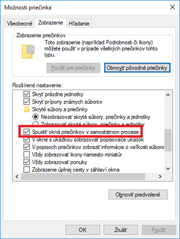 Poznáte to sami, ak zamrzne jedno okno Prieskumníka a vypnete ho cez Správcu úloh, padnú všetky, aktuálne kopírovania súborov a iné procesy. V nastaveniach Možnosti priečinka sa dá zapnúť voľba Spustiť okná priečinkov v samostatnom procese. Toľko k malej odbočke.