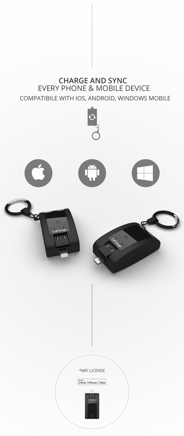 Išlo o užitočnú pomôcku v situáciách, keď ste mali k dispozícii zdroj energie s USB portom, avšak konkrétny kábel vám nemal kto požičať. CulCharge Charge & Data Cable bol teda ten typ produktu, ktorý ste nepoužívali každý deň, ale keď ste ho naozaj potrebovali, zachránil vám život. Alebo aspoň funkcionalitu telefónu. Koncept pôvodného produktu predpokladal, že máte k dispozícii zdroj energie. Nie vždy je tomu tak. Toto je účel tzv. powerbánk a CulCharge vytvoril „najmenšiu powerbanku na svete s 3 funkciami, ktorú môžete nosiť na kľúčenke“. Nazýva sa CulCharge 3-in-1 PowerBank a je dostupná s Lightning a micro USB konektorom.