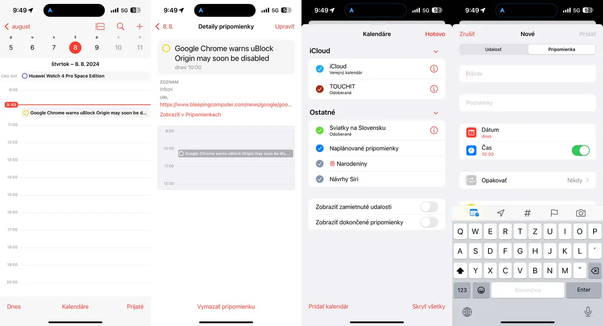 V praxi to funguje jednoducho a prirodzene. Vytvorené pripomienky vidíte v aplikácii Kalendár. Môžete si nastaviť, aby sa zobrazovali aj dokončené pripomienky, alebo, aby sa tie automaticky skryli.