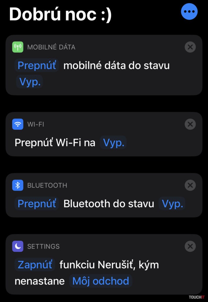 Čo tieto skratky robia? Je to jednoduché – pred zahájením spánku chceme, aby bola bezdrôtová konektivita telefónu (Wi-Fi, mobilné dáta, Bluetooth) v plne vypnutom stave, a taktiež zapíname režim nerušiť, ktorý povolí hovory iba od obľúbených kontaktov – nikto cudzí vás pred budíkom nebude vyrušovať. Tento proces sme niekedy robili „ručne“, teda sme museli samostatne všetko vypínať a ráno znovu aktivovať. Teraz nám na to stačí jeden klik a hotovo. Je dobré vedieť, že ak vypnete napr. Wi-Fi v ovládacom centre iPhonu, tak nie je plnohodnotne deaktivovaná, ale iba v stand-by režime a onedlho sa samostatne zapne a bude vyhľadávať dostupné siete. Takže je potrebné ísť do nastavení a vypnúť ju tam.