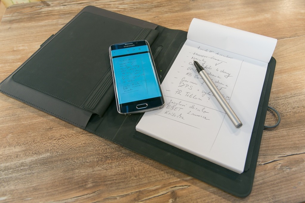 od firmy Wacom je skutočná rarita na našom trhu. Je to zápisník v tvrdých doskách, ktorý obsahuje vlastné pero, batériu a Bluetooth pripojenie. Scenár použitia tohto produktu je jednoduchý. Sedíte napr. na porade a zaznamenávate si poznámky. Následne stlačíte jediné tlačidlo v zápisníku a všetky poznámky sa vám v elektronickej podobe prenesú do mobilného zariadenia.