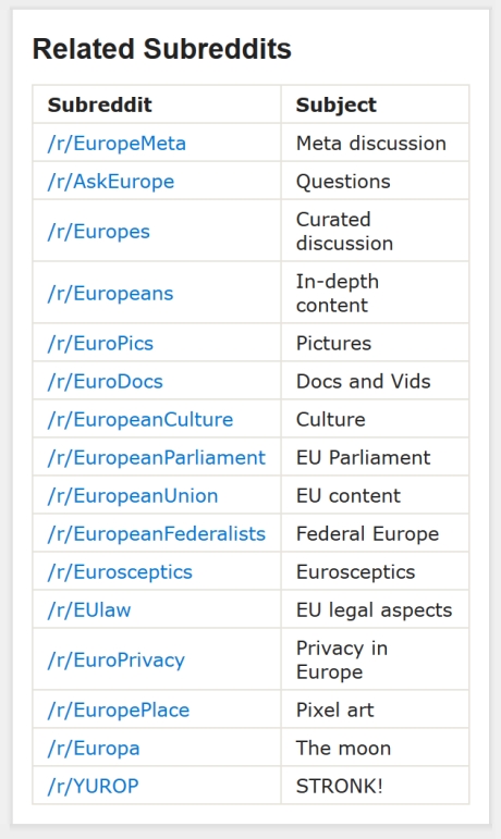 Táto sociálna sieť je dosť dobre premyslená a už po chvíli zistíte, že textový chaos je len zdanie. Totiž každý Subreddit sa dá upraviť tak, aby mal svoju vizuálnu podobu. Potom vyzerá ako keby toto bola hlavná stránka tejto siete. V prípade „európskeho“ máte k dispozícii na výber podobne zamerané subreddity. Napríklad venované obrázkom z európskych krajín – /r/EuroPics alebo kultúre, parlamentu či euroskeptikom alebo napríklad súkromiu – /r/EuroPrivacy.