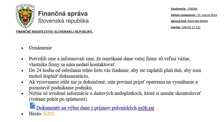 Ide o falošné upozornenie na omeškanie daňovej povinnosti. Mail obsahuje odkaz na falošné dokumenty, ktoré údajne majú obsahovať informácie o výške daňových nedoplatkov. Finančná správa takéto maily neodosiela a daňovníkom odporúča, aby na ne nereagovali a ani neposkytovali žiadne svoje údaje.