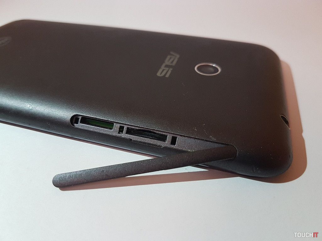 Začíname odobratím dotykového pera, ktoré má špičku z tvrdého plastu. Táto špička je na detailnú prácu nevhodná, nakoľko je podstatne široká. Snímka vpravo ukazuje dve šachty pre microSD kartu a microSIM kartu, ktoré sú pod plastovým krytom. Tento kryt mal pri aktívnom používaní zariadenia tendenciu odstávať.