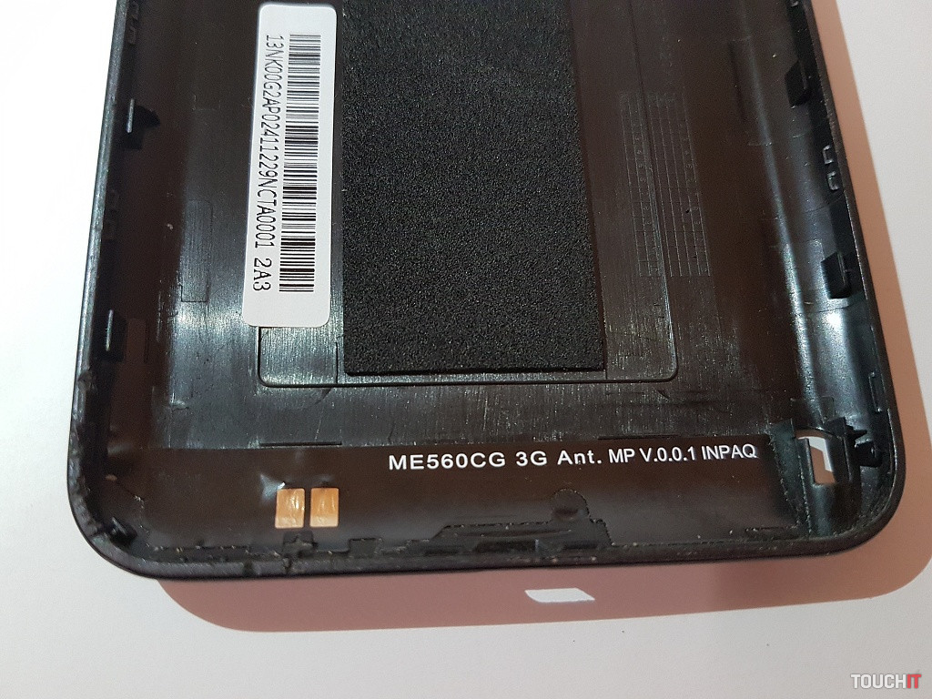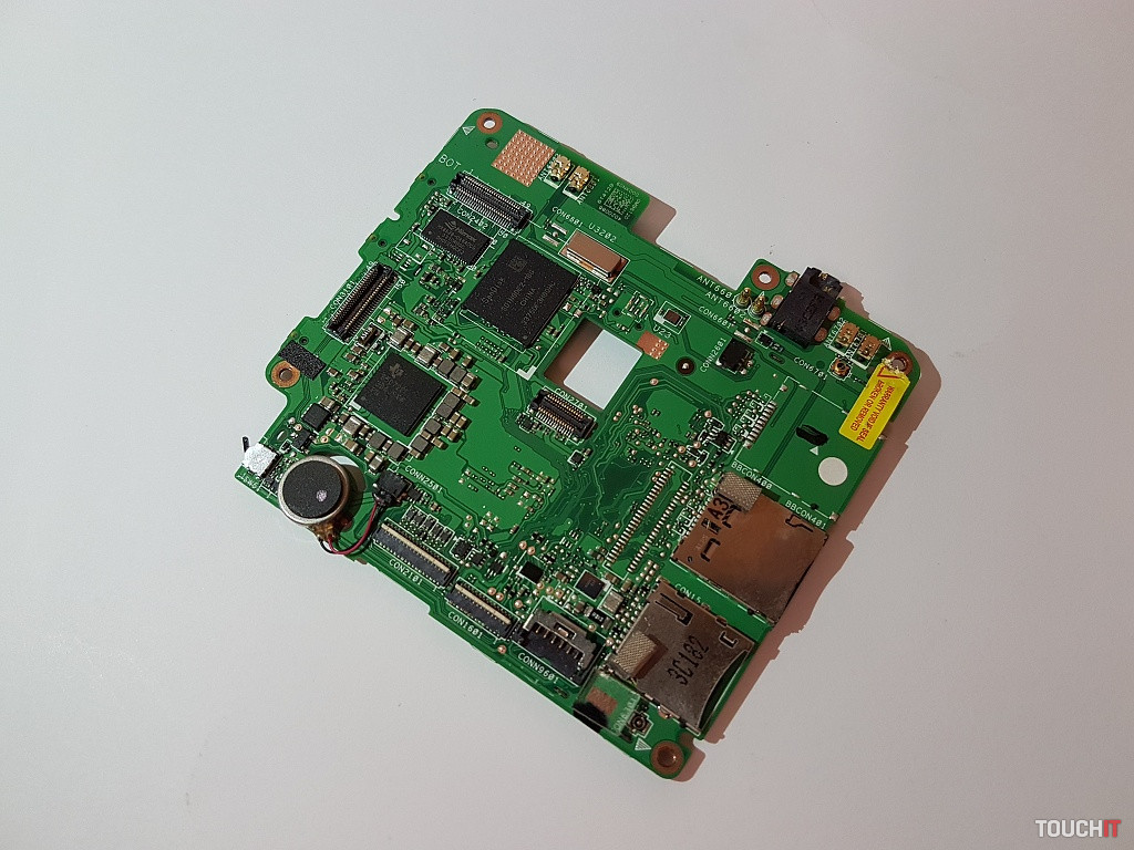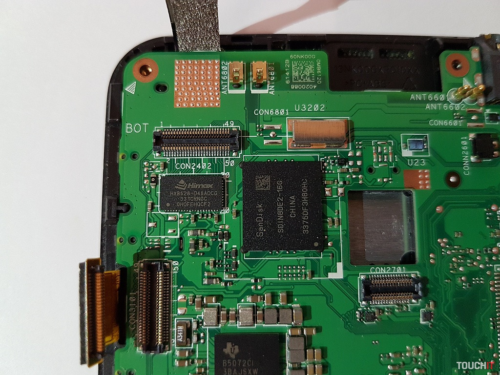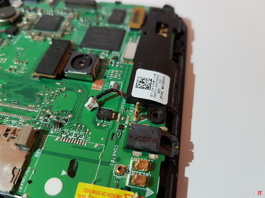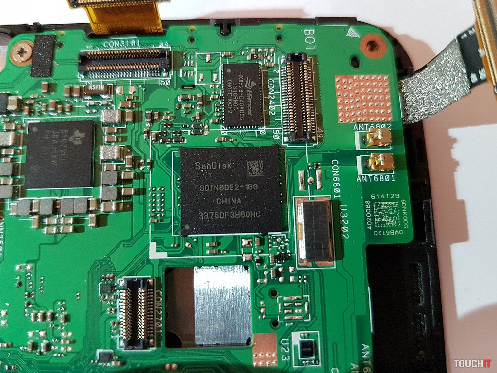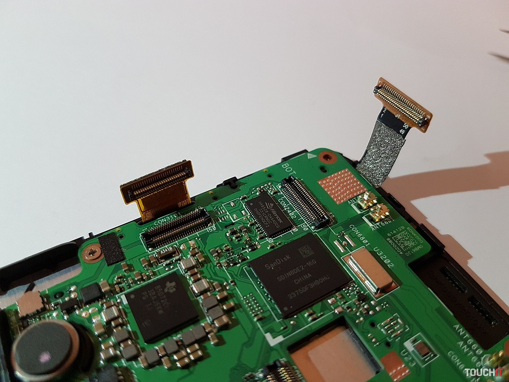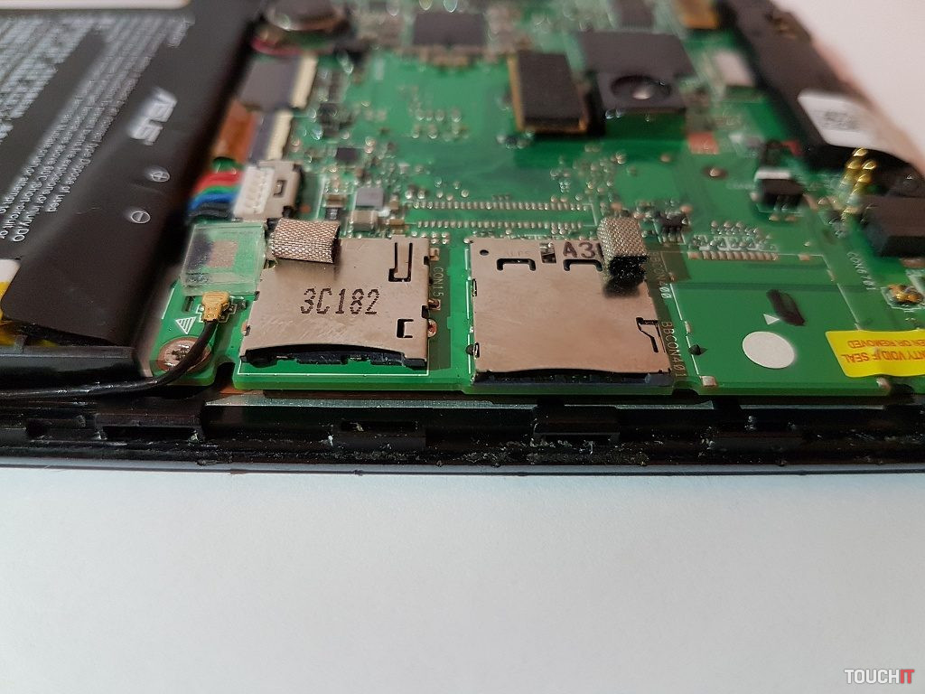 Tu už vidíme nekryté šachty pre microSIM a microSD kartu (max. 64 GB). V ľavej časti je vidieť GSM kábel. Ten prepája GSM anténu v spodnej časti zariadenia s GSM 3G čipom na základnej doske.