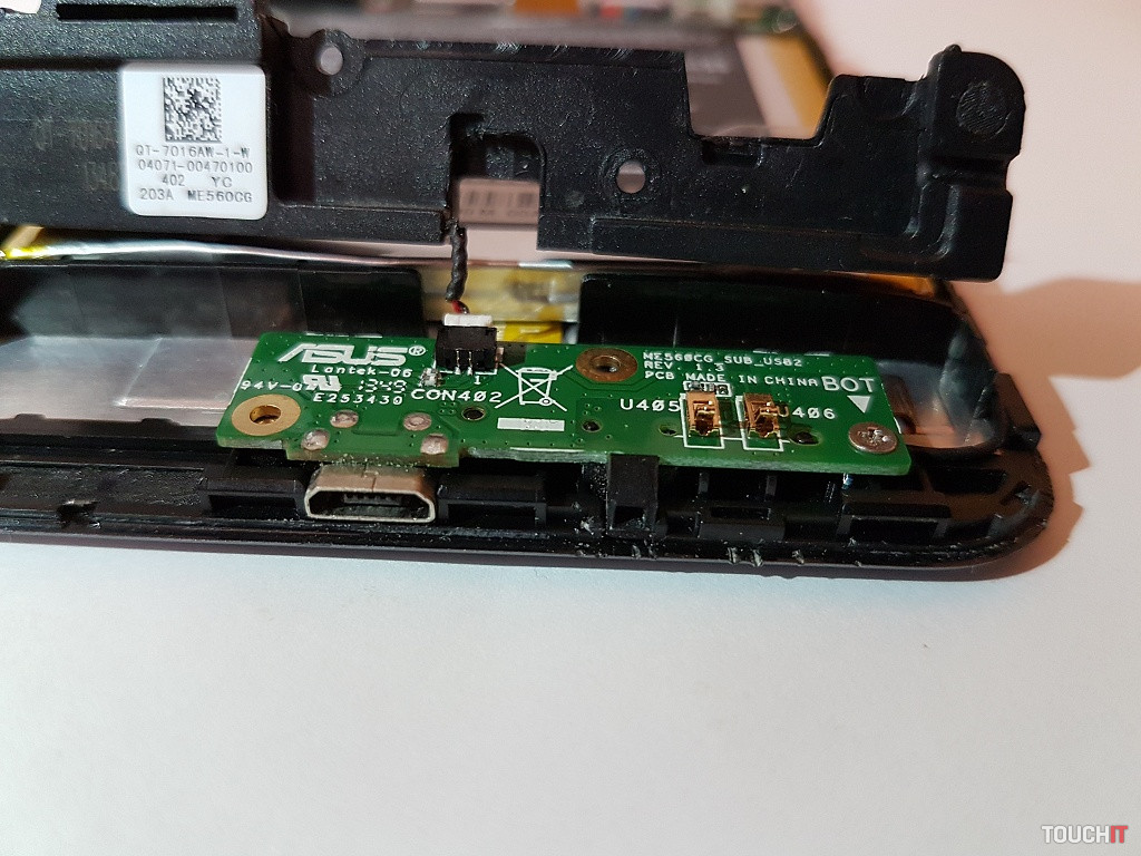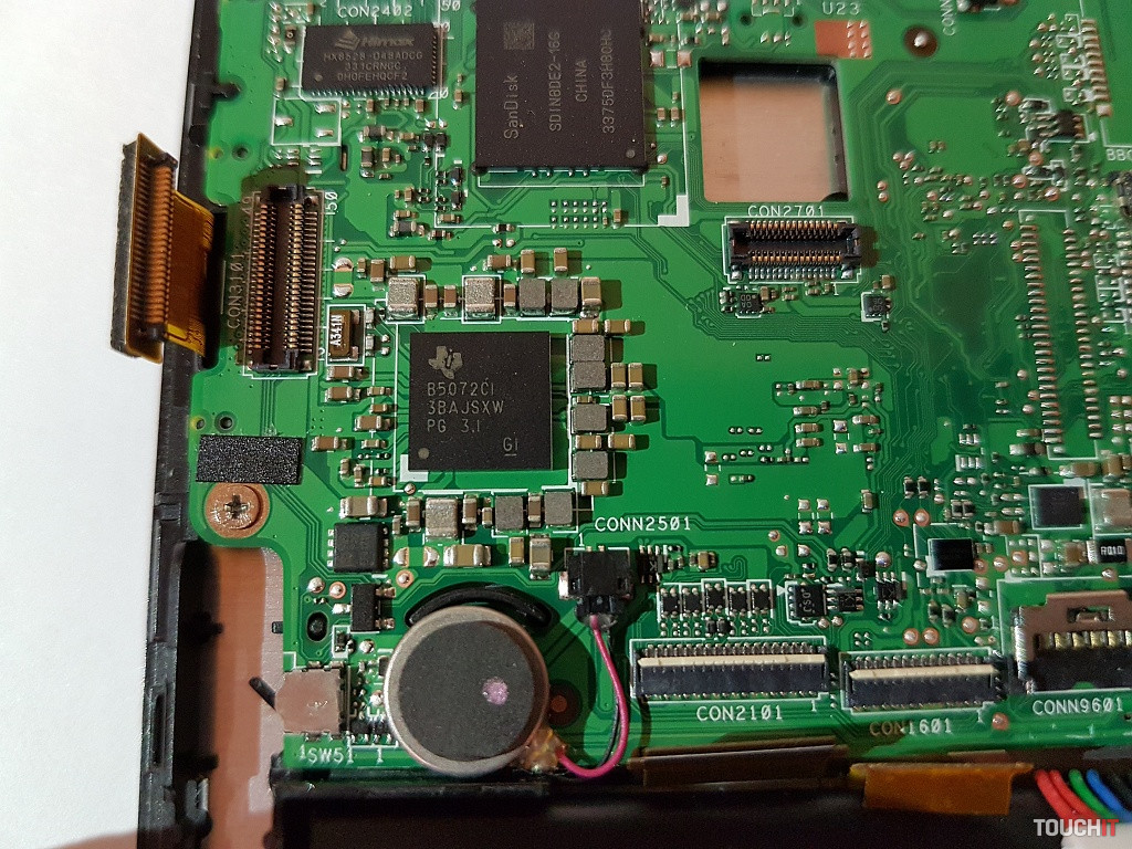 Ďalej sa tu nachádzajú napevno umiestnené tlačidlá hlasitosti a napájania (ľavá snímka). Na pravej snímke vidieť spínač dotykového pera, ktorý má za úlohu registrovať jeho prítomnosť. Za ním (guľaté teleso) je vibračný motorček.