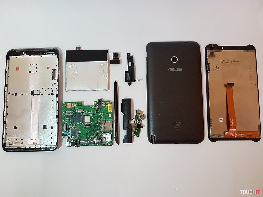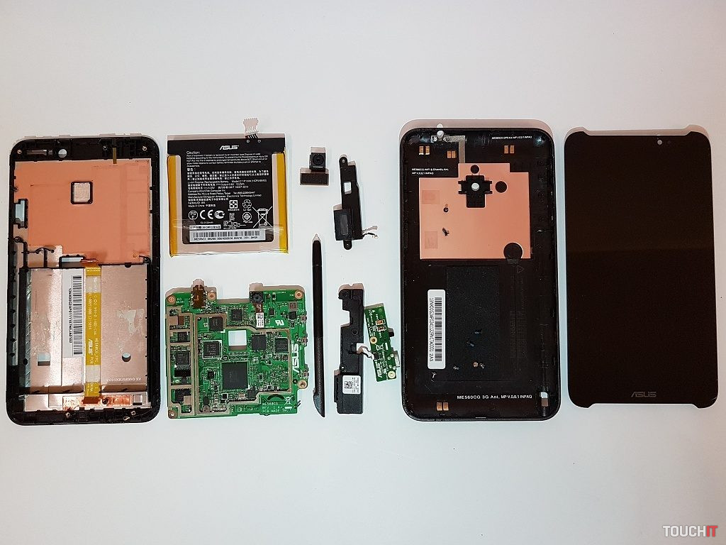 Displej bola posledná súčasť zariadenia, ktorú bolo treba oddeliť. Na snímke nižšie vidieť kompletne rozpitvané zariadenie ASUS Fonepad Note 6, so všetkými komponentami.
