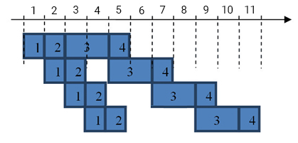 Ako vidíme, cestár (1) robí vždy v jeden moment len jedno cesto, takisto ako rozvaľkávač (2) vždy vaľká jedno a zdobič (3) vždy jedno zdobí. Celý proces je značne rýchlejší. Kým predtým nám jedna pizza trvala 4 tiknutia (4 minúty) a štyri pizze by nám trvali 16 tiknutí (16 minút), takto štyri spravíme už za 7 tiknutí, teda 7 minút. Každé jedno tiknutie pritom ďalšiu pizzu pridá. Za 8 minút bude 5 pízz, za 9 minút už 6 a za 11 minút už 8.