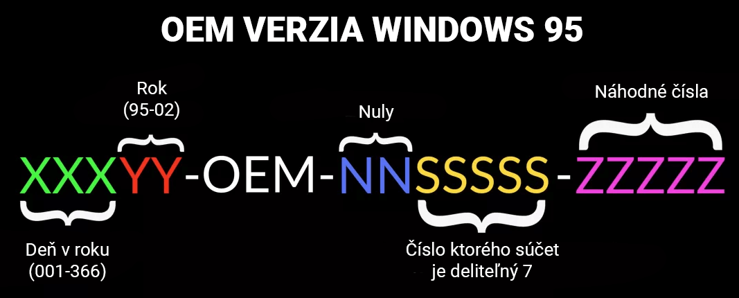 Pomlčky a OEM značka týchto druhov operačných systémov sú pevné no a po nich nasleduje to známe sedemčíslie, ktoré sa riadi rovnakými pravidlami o delení sedmičkou (avšak prvé dve čísla vždy musia byť 00). Posledné päťčíslie je už len náhodné.