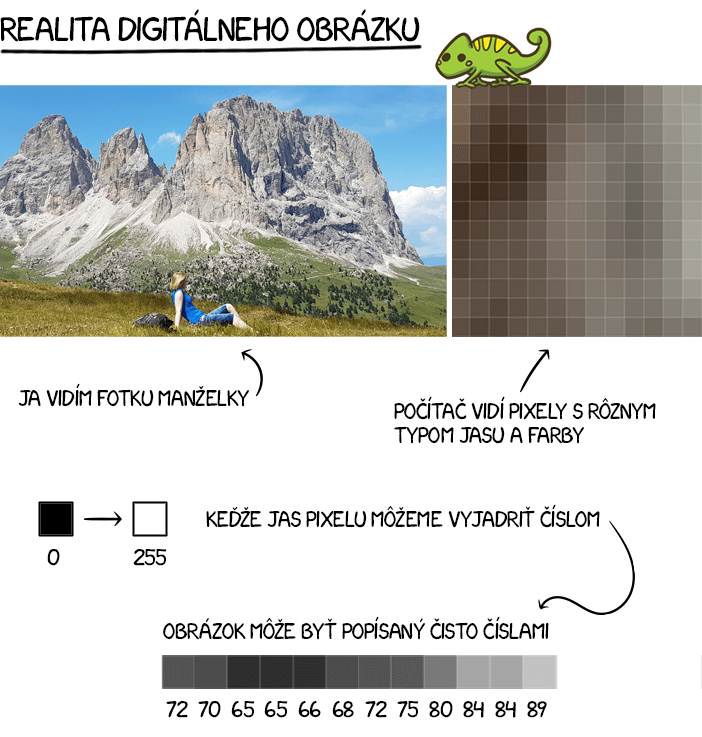 V základe si uvedomte, že JPEG vidí obrazovú informáciu ako čísla. My síce vidíme obrázok ako celok a vidíme na ňom tigra, písmo alebo ženské ňadro, ale JPEG vidí len jednotlivé pixely a to, že ten tretí pixel zľava v druhom riadku má hodnotu jasu 79 a hodnotu červenej farby 54.