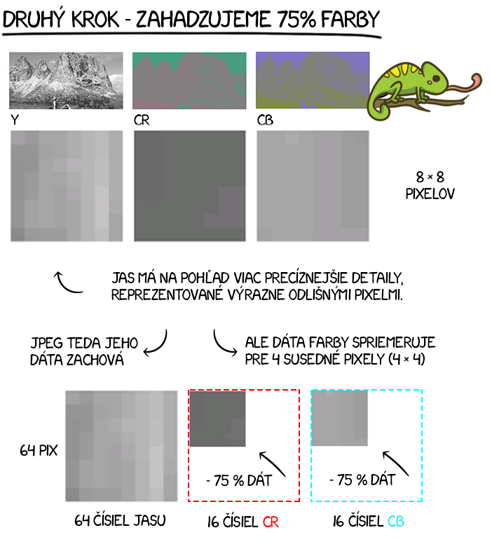 Vytvorí si tak dobre popísaný „čiernobiely“ 8 × 8 pixelov veľký úsek, ktorý vidíte ako druhý zľava (Y). Farbu si následne uloží oddelene, čo sú hodnoty nasledovných štvorcov. Ide o metódu, respektíve farebný model, YCrCb, čo v jednoduchom rozpise znamená, že má tri hodnoty. Priemerný čiernobiely jas (Y) a červenú a modrú odlišnosť farby (Chroma red, Chroma blue).