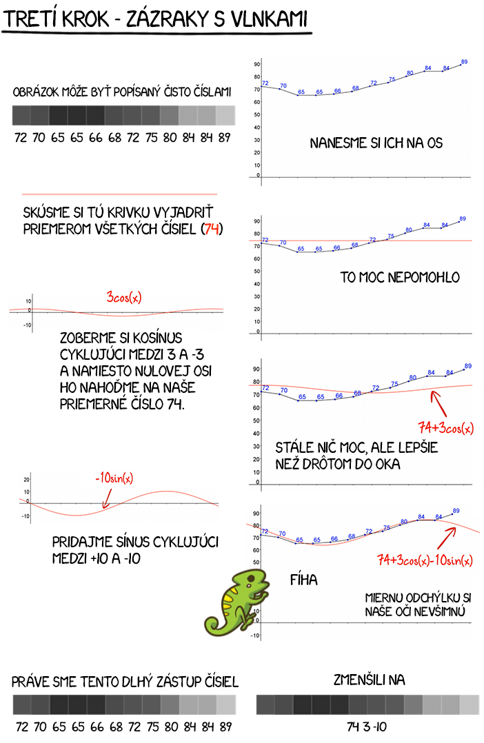 NIE POČKAJTE. Neutekajte preč. Nebudeme tu riešiť matematiku. Skrátka ide o to, že každý kus obrázku reprezentuje vždy nejaký zástup čísiel (hodnôt). Namiesto zapamätania každej zvlášť ale ušetríme hromadu miesta tým, že si nebudeme pamätať čísla ako také, ale len ich vhodný popis.