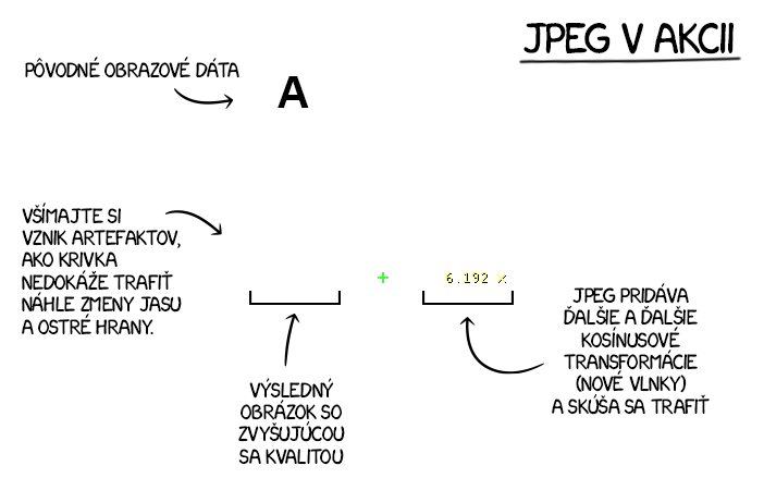 Zaujímavé, že? A práve tu je problém s písmom a obrázkami plochej grafiky. Kvôli ostrým a vo svete neprirodzeným prechodom čísla jasu masívne skáču (z veľkých na malé hodnoty a to okamžite) a ak ich chce JPEG presne popísať vlnkou, musí byť mimoriadne komplexná.