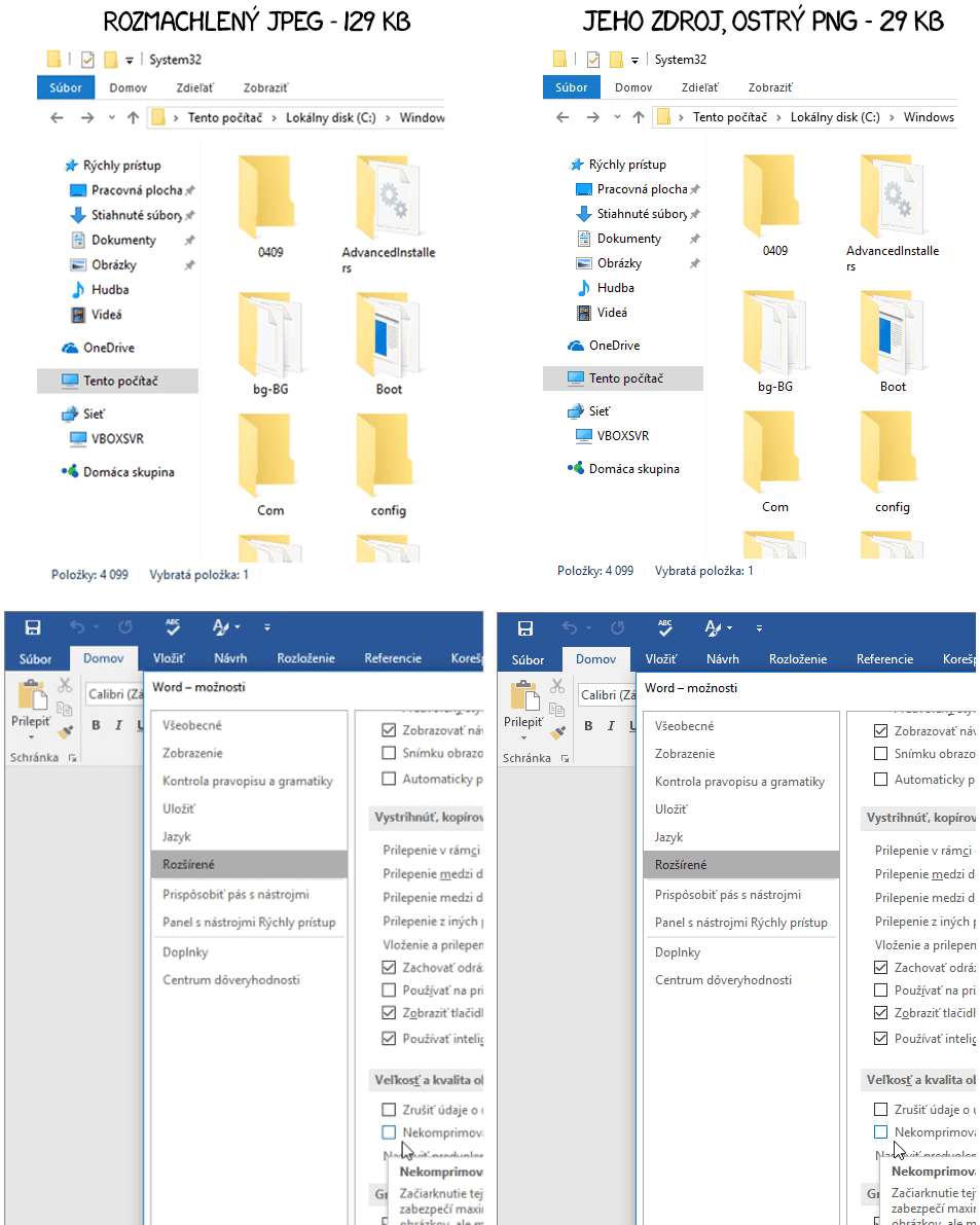 Obzvlášť snímky obrazovky z bežných programov (nie z hier a videa) by v JPEG formáte nikdy nemali byť. Stačí sa pozrieť na obrázok vyššie, aby ste zistili prečo.