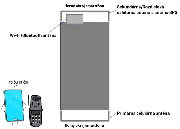 Hlavná celulárna anténa, respektíve jej rameno, je na smartfónoch v drvivej väčšine prípadov v dolnej časti. V hornej nájdeme obvykle antény pre Wi-Fi/Bluetooth a GPS.