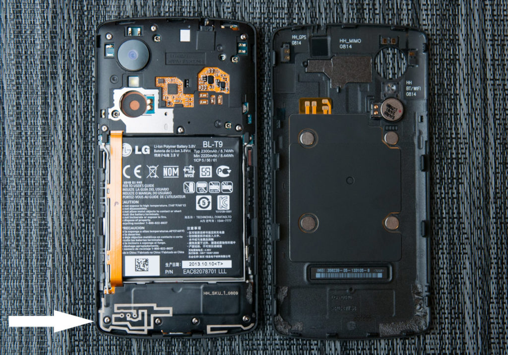 To, že môže ísť aj o krkolomné tvary môžete vidieť na spodnom obrázku telefónu Nexus 5. V oboch prípadoch si vytvorenie zvyšku antény v rámci celej konštrukcie nepleťte s konštrukciami veľkých cievok bezdrôtového napájania, ktoré v prípade Galaxy presvitajú ako veľký kruh a v prípade Nexusu ako veľký štvorec vpravo.