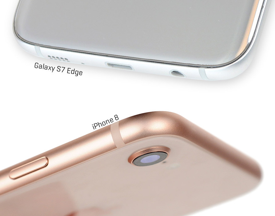 Mnohé telefóny, ako napríklad Galaxy od Samsungu, alebo aj nové iPhony majú toto plastové prerušenie len po bokoch, pretože zadná strana nie je z kovu, ale z plastu a skla, prípadne z iných špecifických zmesí materiálov. To môžete dobre vidieť na obrázku nižšie. Na iPhone 8 je vidieť dobre aj to, ako plastové prerušenie v skutočnosti obkolesuje celý zadný kryt.