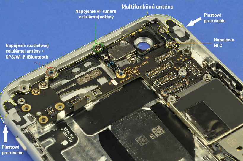 Na tomto obrázku môžete vidieť hornú konštrukciu antény smartfónu iPhone 6. Základom je samotné telo smartfónu, respektíve kovová obvodová konštrukcia, vyznačená žltou bodkovanou čiarou. Slúži ako súčasť antén rôzneho typu. Červeným krúžkom vľavo vidíte označenú časť, kam do nej vchádza kontakt vodiča 2,4 GHz antény určenej pre Wi-Fi, Bluetooth a takisto GPS. V zelenom bode je na ňu napojený čip rádiofrekvenčného tuneru a v oranžovom bode NFC.