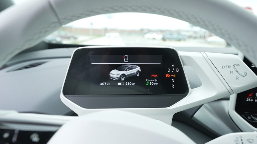 Na rýchlonabíjacej stanici s jednosmerným prúdom sa dá ID.4 s batériou 77 kWh približne za 30 minút nabiť na ďalších 320 km (podľa WLTP). Maximálny podporovaný nabíjací výkon je 125 kW. V domácej garáži je ideálne mať vlastný wallbox a vtedy je možné batériu nabíjať pomocou 11 kW výkonu. Takto batériu nabijete doplna počas noci a cez môžete jazdiť. Na rýchlonabíjačke ZSE Drive na R1 Terminal Beladice sme strávili 52 minút pri nabití z 15% na 80 % kapacity batérie.