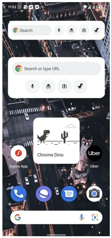 Druhým v poradí je widget s rozmermi 2 × 2, ktorý ponúka priamy prístup ku hre „Chromium Dino„. Ide o jednoduchú offline hru. V nej pomocou T-Rexa odstraňujete prekážky, ktoré sa mu postavia do cesty. Hra je dostupná v oboch verziách widgetov.