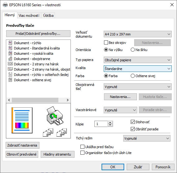 Tlačový ovládač pre EcoTank L6160 s možnosťami nastavenia tlače, Zdroj: EPSON