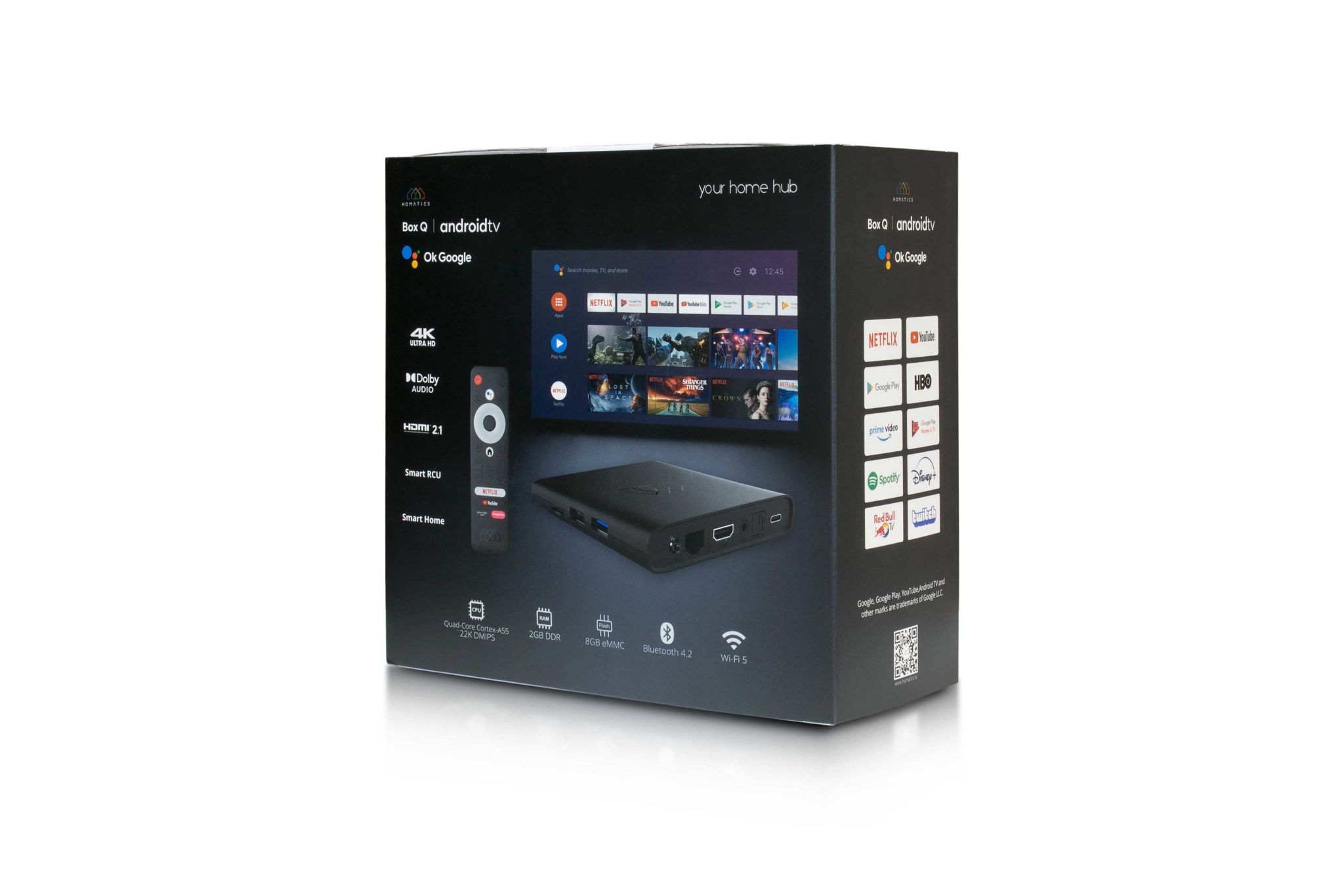 Toto zariadenie prichádza v podobe malej krabičky s hmotnosťou menej ako pol kila a veľkosťou externého 2,5“ disku. Na prednej strane je len LED dióda a prijímač IR signálu od diaľkového ovládania. Zaujímavé je to však vzadu, kde sa pripája externý napájací zdroj (12 V), Ethernet, HDMI 2.1 port na spojenie s televízorom alebo displejom, potom je tu AV výstup napr. na napojenie staršieho televízora bez HDMI portu, optický výstup zvuku S/PDIF a port USB-C na spojenie napr. s externým diskom na prehrávanie multimediálneho obsahu z neho, prípadne na možnosť nahrávania v niektorej z aplikácii. Nemáte externý disk s USB-C portom? Nevadí, na pravej strane je ešte USB 2.0 a USB 3.0 port a čítačka na microSD kartu. Opäť sú to možnosti ako prehrať na pripojenom zobrazovacom zariadení externý obsah, ktorý nie je na internete alebo v domácej sieti, ale máte ho ako súbor (napr. fotky v JPG, hudba v MP3, videá ako MP4 či MOV). Box Q pritom podporuje moderné formáty ako napr. H.265 či VP9 Profile-2.