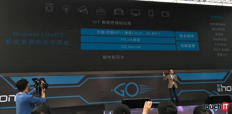 Huawei LiteOS predstavil prezident Honoru. Je súčasťou stratégie pre Internet vecí. Na fotke si všimnite kategórie produktov, pre ktoré je platforma určená