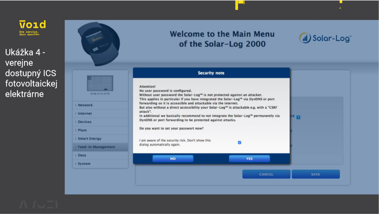 Zavádzanie princípov SMART Industry nielen do priemyselnej výroby, ale napríklad aj do dodávateľsko-odberateľských vzťahov, priniesol so sebou aj vyššiu prístupnosť priemyselných riadiacich systémov z verejného internetu. „Vzdialený prístup je dnes bežne využívanou metódou na monitorovanie nielen výrobných technológií alebo logistiky zásobovania výroby, ale napríklad aj malých vodných či solárnych elektrární,“ upozorňuje Martin Lohnert z Void SOC.