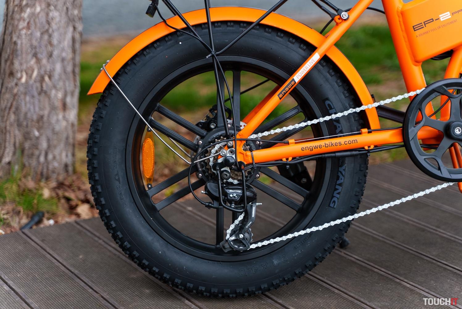 Motor je umiestnený v náboji zadného kolesa a tu je aj 7-stupňová prevodovka Shimano RD-TY300 (relatívne lacný model). Páči sa nám, že táto prevodovka je chránená proti poškodeniu pri páde bicykla na zem.