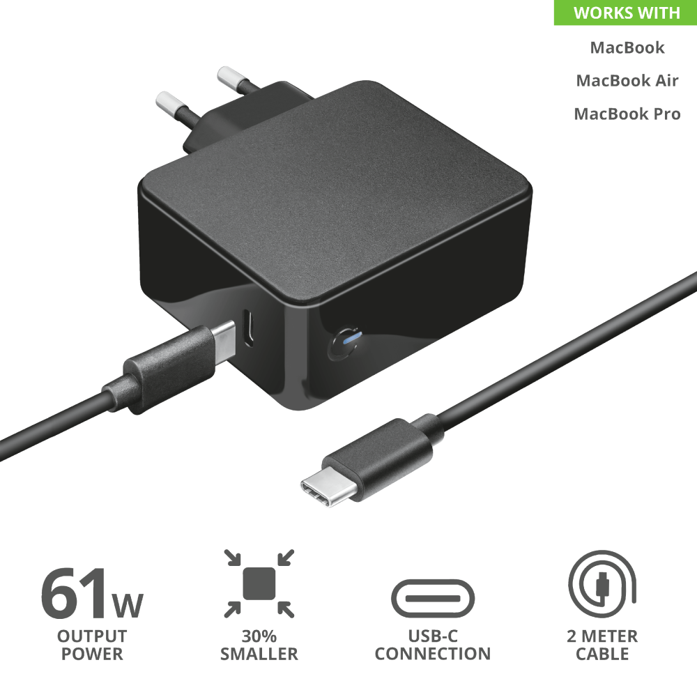 Nabíjačka notebookov značky Apple s výkonom 61 W spoľahlivo a bezpečne nabije nielen laptop, ale aj iné zariadenia s USB-C a to vďaka svojmu vysokému výkonu, aj pomocou rýchleho dobíjania USB PD 3.0. V balení je nabíjací kábel dlhý 2 m a adaptér má zabudovanú ochranu proti prepätiu a prebitiu, o 30% menšie rozmery než originál aj nižšiu váhu.