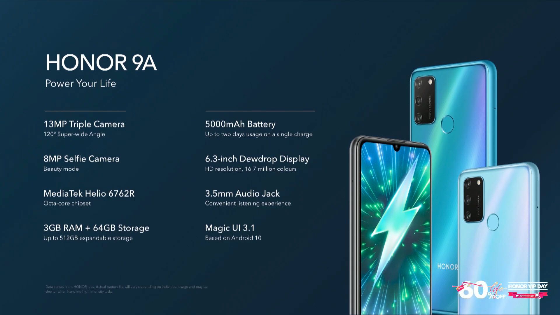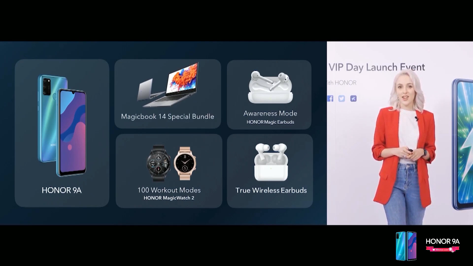 Honor na globálnej tlačovej konferencii ukázal najprv telefón Honor 9A. Ten je lacnejší a je zameraný hlavne na obrovskú kapacitu batérie. Tá má kapacitu až 5000 mAh. Ide o telefón s AppGallery, teda službami Huawei. Ďalej sme videli bezdrôtové slúchadlá True Wireless Earbuds alebo nové vylepšenia slúchadiel HONOR Magic Earbuds a inteligentných hodiniek HONOR MagicWatch 2. HONOR zároveň odštartoval aj globálne HONOR VIP Days, čo sú zľavy na najnovšie a najobľúbenejšie modely. Zľavy budú na Slovensku platiť až do konca mesiaca.