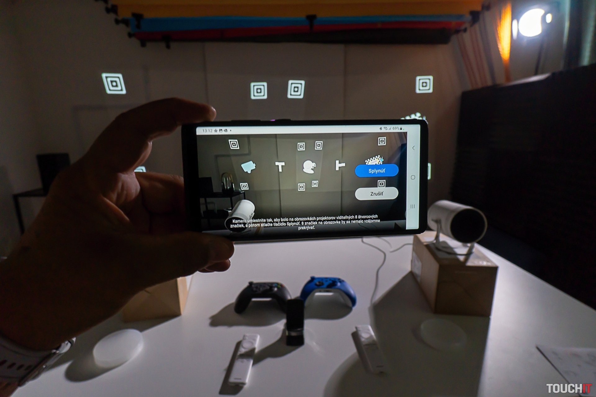 Prichádzame k prekrývaniu obrazovky. Na oboch projektoroch sa vytvorí špeciálny obraz a vašou úlohou je manipulovať s projektormi tak, aby sa stredná nálepka v obrazoch spojila. Je to celkom ľahké a ak máte projektory položené na stole, je to o pár sekúnd. Ak je obraz správne spojený, po odsúhlasení sa vytvorí scéna, ktorá obsahuje 8 štvorčekov. Tento obraz následne nasnímate pomocou fotoaparátu vášho telefónu. Obraz sa potom spojí a môžete prehrávať fotografie. Celý proces spájania môžete zopakovať, ak nie ste s kvalitou vytvoreného obrazu spokojní.