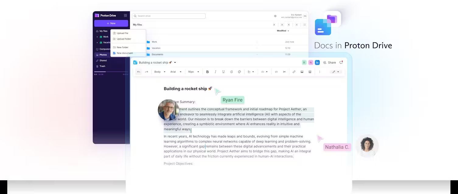 VPN, emaily, kalendár a šifrovaný cloud pre bežných ľudí poznáme. Riešenie Proton Drive for Business je cielené na firmy, ktoré vďaka novej službe a účtovaniu aj podľa používateľských kont majú k dispozícii bezpečný cloud. Služba ponúka to, na čo ste zvyknutí v rámci iných služieb. Teda napríklad zdieľanie súborov, práca na dokumentoch v reálnom čase cez vlastnú aplikáciu na tvorbu dokumentov, a to všetko s koncovým šifrovaním.