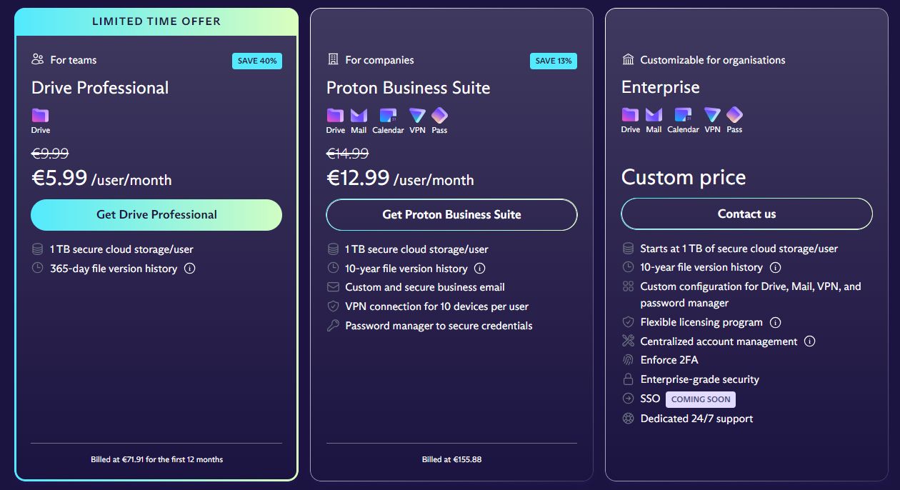 Proton Drive for Business je k dispozícii v troch predplatných s najlacnejším Professional od 5,99 eura na používateľa za rok. Ponúka 1 TB cloudový priestor a 365-dňovú históriu súborov. Od verzie Suite za 12,99 eura na používateľa a rok získate aj všetky ostatné služby a 10-ročnú históriu súborov. Kompletná ponuka je zverejnená na stránke Protonu.