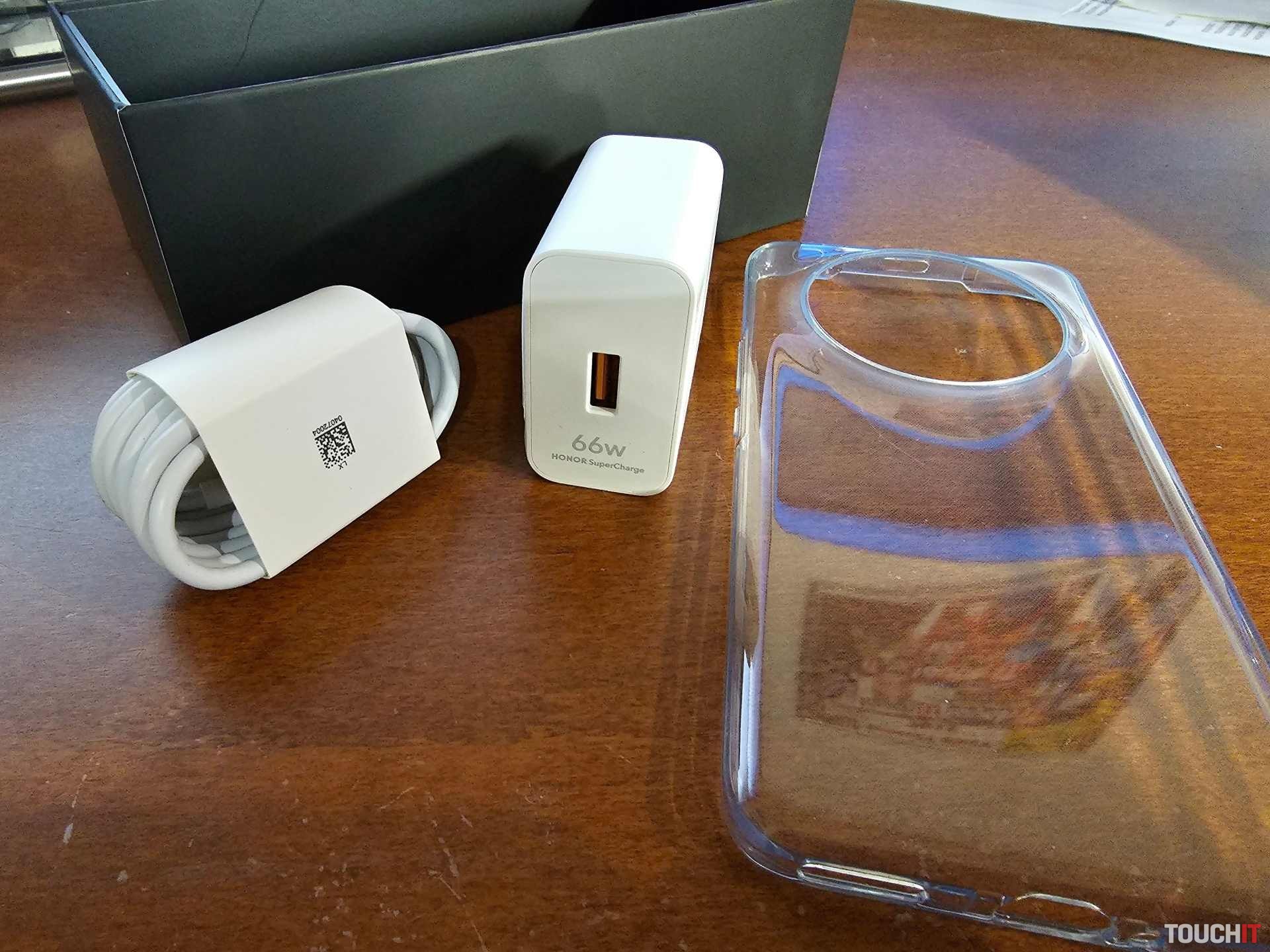 Na toto si dal HONOR pozor a v dodávke nájdete všetko – napájací zdroj, 66 W napájací zdroj a príslušný USB-C kábel. Telefón teda umožňuje 66 W káblové napájanie a 50 W bezdrôtové nabíjanie. V dodávke nájdete aj priesvitný plastový obal.