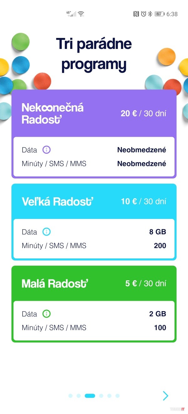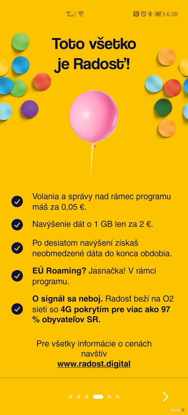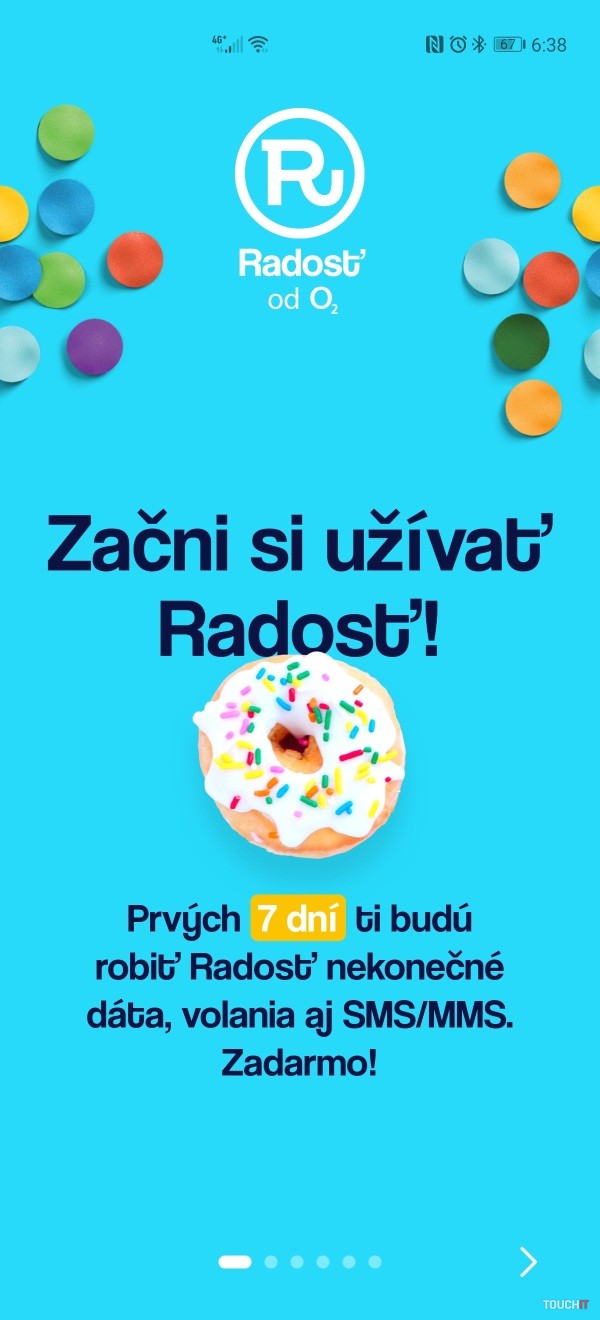 Digitálny operátor Radosť spustil svoju ponukua pokiaľ máte smartfón so systémom Android, už si môžete objednať jeho SIM kartu cez mobilnú aplikáciu. Aplikáciu Radosť si môžete stiahnuť z Obchodu Play a z App Store pre iOS. A pokiaľ používate Huawei smartfón bez Google služieb, odporúčame obchod Aurora Store (neoficiálny klient pre Google Play, viac info TU), z ktorého sme si Radosť stiahli aj my. Radosť vás po prvom spustení mobilnej aplikácie prevedie procesom objednania novej SIM karty. Celý proces sme zdokumentovali vo forme screenshotov, ktoré obsahujú aj kľúčové informácie – služby Radosti využívate prvých 7 dní zadarmo, následne si musíte zvoliť jeden z programov v cene 5, 10 a 20 eur. V prvom kroku vám Radosť oznámi užitočné informácie, ktoré by ste mali o jeho službách vedieť, predstaví ponuku programov a ceny za prípadnú nadspotrebu: