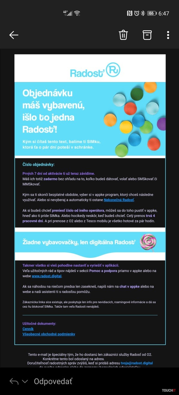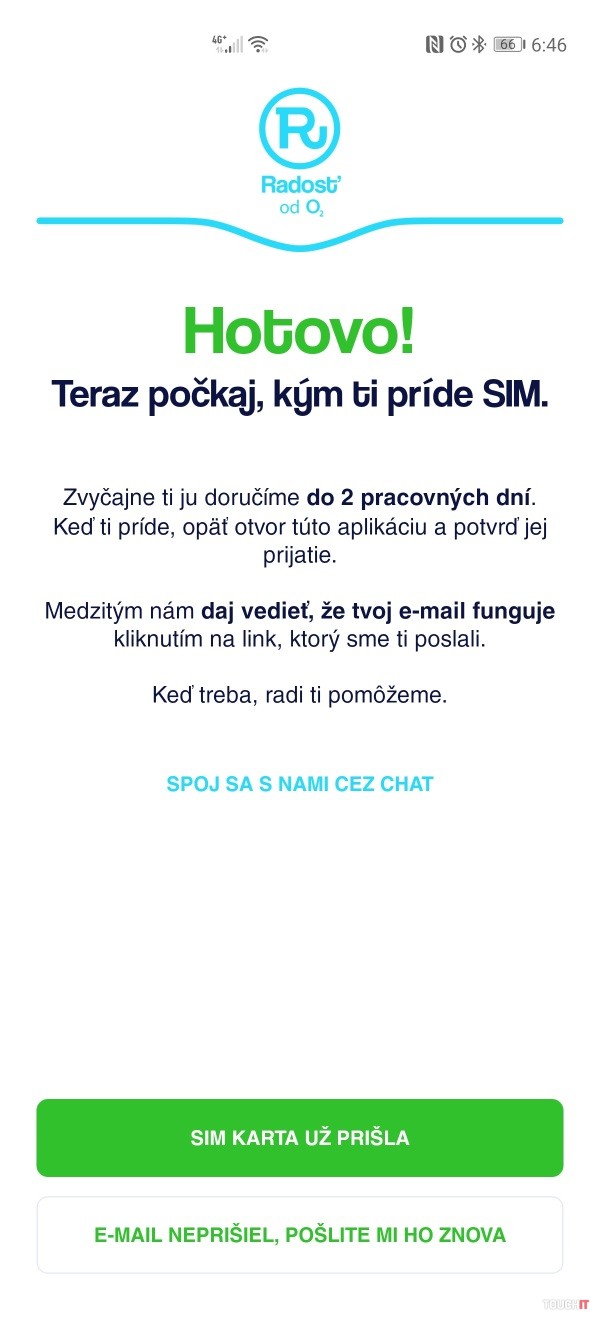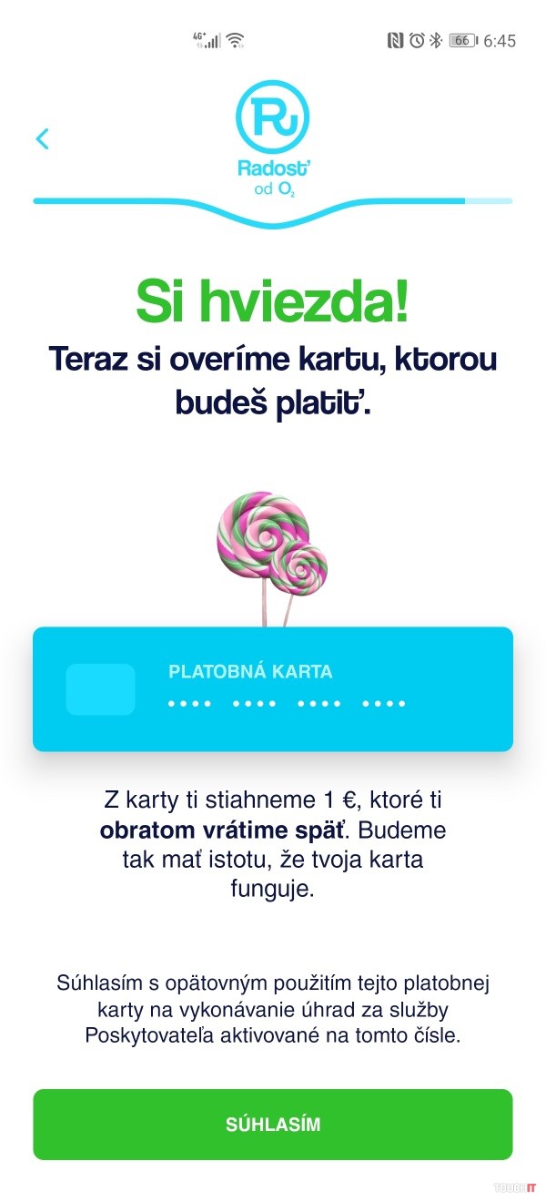 Posledným krokom je zadanie platobnej karty. Tá sa overí platbou vo výške 1 eur, ktorú vám Radosť následne vráti späť. Touto kartou budete platiť za služby operátora. Po zadaní platobnej karty je SIM karta objednaná, mala by vám prísť do schránky do dvoch pracovných dní. Treba ešte overiť emailovú adresu a úvodný proces je úspešne na konci.