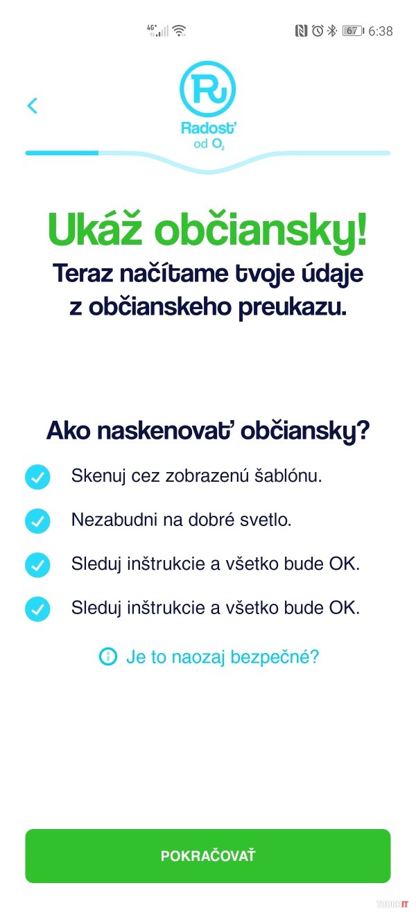 Po zobrazení všetkých podstatných informácií začína proces objednania SIM karty. Aplikácia vám oznámi, že budete potrebovať občiansky, email, adresu a platobnú kartu. Skenovanie občianskeho preukazu v našom prípade prebehlo v priebehu pár sekúnd a informácie z oboch strán dokladu sa úspešne a bezchybne načítali pomocou zadného fotoaparátu priamo do aplikácie.