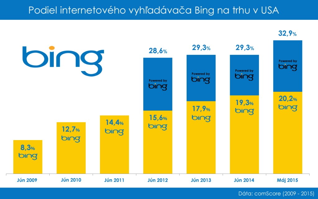 Microsoft sa na trh internetových vyhľadávačov dostal miernou okľukou, prostredníctvom svojho webového portálu MSN.com, ktorý spustil v roku 1995 spoločne s vydaním Windows 95 a nastavil ho ako domovskú stránku svojho nového prehliadača Internet Explorer. Súčasťou stránky bol vyhľadávač MSN Search, ktorý poskytoval výsledky pomocou vyhľadávacích systémov iných spoločnosti (Inktomi a AltaVista). Tak tomu bolo až do roku 2004, keď Microsoft začal pracovať na svojom vlastnom vyhľadávacom mechanizme, ktorý prešiel do plnej prevádzky v roku 2005 a v nasledujúcom roku dostal meno Live Search. Ten mal pomerne ťažkopádny štart a mizivý trhový podiel a po mnohých reorganizáciách a združovaní služieb Microsoft napokon pristúpil ku kompletnému rebrandingu a technickému vylepšeniu, ktoré napokon spustil v lete roku 2009 pod menom Bing. Spustenie bolo vskutku pompézne a reklamná kampaň zhltla 100 miliónov dolárov. Bing však dostal do vienka 8,3 % podiel na americkom trhu a stal sa po Google a Yahoo tretím najpoužívanejším vyhľadávačom v krajine. Do jedného roka stúpol jeho podiel na 12,7 % a o ďalší rok neskôr, teda v lete 2011, na 14,4 %. Tým sa dostal na úroveň Yahoo a začal preberať štatút americkej vyhľadávacej dvojky. Jeho rast sa nezastavil ani v roku 2012, pričom sa jeho podiel zvýšil na 15,6 %. V danom roku navyše vstúpila do platnosti dohoda so spoločnosťou Yahoo, ktorá začala používať vyhľadávací mechanizmus Bingu. Spolu s 13 % podielom Yahoo tak Bingu začal patriť viac ako štvrtinový podiel na vyhľadávacom trhu v USA. V lete roku 2013 jeho podiel vystúpil na 17,9 % (+ Yahoo 11,4 %) a v lete 2014 na 19,3 % (+ Yahoo 10 %). Súčasný 20,2 % podiel teda hovorí jasnou rečou a stúpajúca tendencia je obdivuhodná, pretože presadzovať sa v rámci trhu, kde dominuje jedna spoločnosť, je vždy nesmierne zložité. Vonkoncom nejde len o to, aby sa služba silou mocou snažila presadiť len tým, že sa objaví predvolená napríklad v internetových prehliadačoch. Na tom pravdaže nie je nič zlé, veď enormne pretláčací systém použil aj Google pri svojom internetovom prehliadači Chrome, ktorý sa rýchlo rozšíril aj vďaka tomu, že vykukoval nielen zo stránok vyhľadávača, ale  mnohým ľudom sa, skôr nechcene, nainštaloval do počítača v rámci „bundlovania“ do inštalátorov iného softvéru. Ani najväčšie tlačenie reklamnou kampaňou a automatické pribaľovanie k iným produktom však nepomôže v prípade, ak sú služba alebo produkt zlé. Na grafe trhového podielu Bingu môžete vidieť, že stúpanie podielu pokračuje plynulo už mnoho rokov. Nejde teda o nejaký zvláštny výkyv spôsobený krátkodobou reklamnou kampaňou a podobne. Mnohokrát sa stretneme s názorom, že Bing je skôr pre tých technicky menej zdatných ľudí, čo sa k nemu dostali od základu napríklad v programe Internet Explorer a nevedia, že vyhľadávač Google je niečo lepšie. V posledných piatich rokoch však Internet Explorer spadol zo svojej dominantnej pozície, pričom pozíciu najrozšírenejšieho prehliadača prebral Google Chrome a Internet Explorer hrá vyrovnanú partiu s trhovým podielom Firefoxu. Aj napriek tomu všetkému, podiel Bingu na americkom trhu stále stúpa, takže to rozhodne nemôže byť iba tým, že niekto Google nepozná. Nie je to teda tak, že Bing už v USA ponúka lepšie služby, ktoré si pomaly, ale isto nachádzajú svojich verných používateľov?