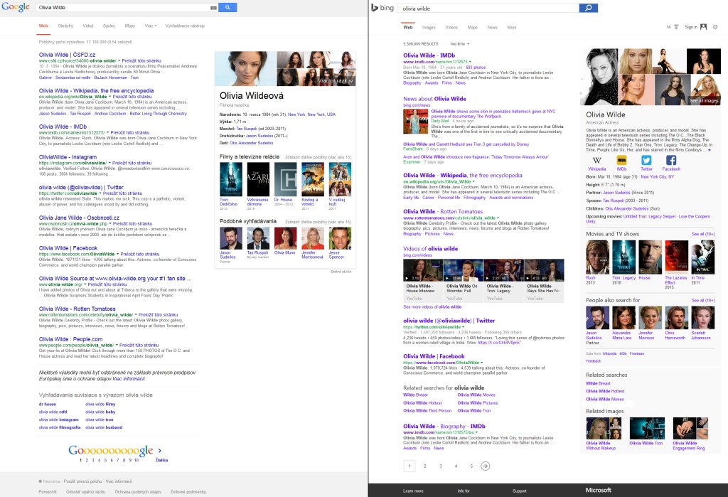 Porovnanie agregácie dát osobnosti vo vyhľadávači Google a Bing (vpravo)