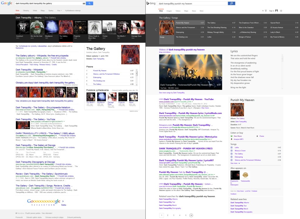 Porovnanie zobrazenia skladby hudobnej kapely. Bing (vpravo) nielenže zobrazí prehľadne obsah albumu, ale ukáže aj video vybranej skladby vrátane jej textu a ponúkne zakúpenie celého albumu