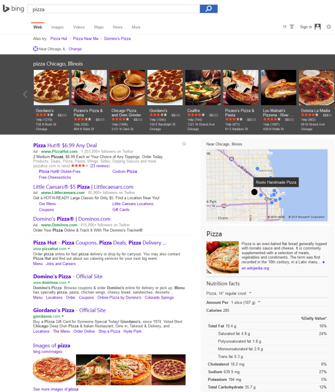 Vyhľadanie jedla v Bingu spustí agregáciu nielen nutričných hodnôt, ale aj relevantných reštaurácii v okolí, ich recenzií, fotografií a otváracích hodín