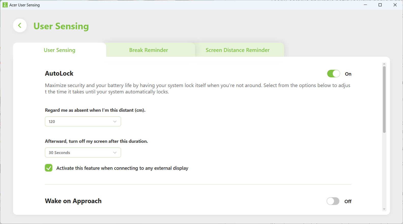 Kamera sa dá použiť aj na prihlasovanie, keďže podporuje infračervené rozpoznávanie. Okrem toho je k dispozícii softvér Acer User Sensing. Vďaka tomuto softvéru môžete nastaviť monitorovanie toho, ako sedíte za počítačom a sledovanie, či sa nehrbíte. V závislosti od nastavení dostanete odpovedajúce upozornenie. V prípade potreby je možné túto funkciu pozastaviť alebo úplne vypnúť.