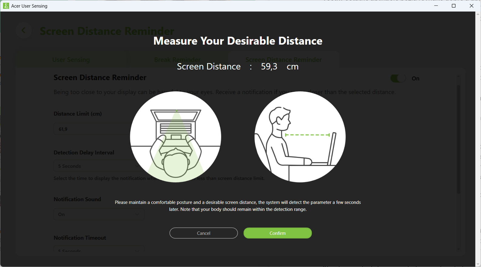 AI je v tomto prípade využité aj na sledovanie toho, ako sedíte za počítačom. Výrobca pridal softvér Acer User Sensing, ktorý bude sledovať, ako blízko ste voči obrazovke a či sa nehrbíte. Prvotné nastavenie treba nakalibrovať a po zapnutí kamery stlačíte tlačidlo na rozpoznanie vašej aktuálnej vzdialenosti.