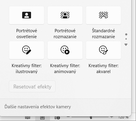 Vďaka tomu, že je tu procesor s vlastnou neurónovou jednotkou so 45 TOPS, je možné využívať aj Windows Studio Effects bez negatívneho vplyvu na batériu. Tieto efekty slúžia na upravenie vášho obrazu počas videokonferencií a sú dostupné z Panela úloh z časti, kde sú ostatné nastavenia parametrov ako Bluetooth, Wi-Fi, atď.