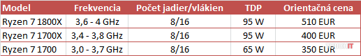 Ponuku série Ryzen 7 uzatvára model 1700, ktorý predstavuje pre herný počítač i pracovnú stanicu na renderovanie a tvorbu obsahu cenovo najvýhodnejšiu cestu. S cenou len 350 EUR je pre takýto scenár skvelým základom. Stále dostanete 8 jadier a 16 vlákien v jednom puzdre, základná frekvencia je však výrazne nižšia, okrúhle 3 GHz, čo má aj pozitívny efekt v podobe nižšej spotreby procesora.
