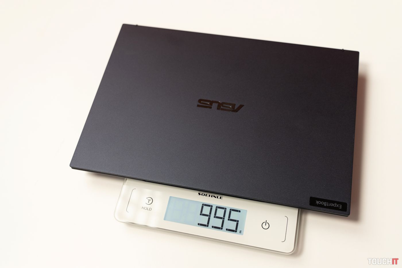 ExpertBook B9 OLED má šasi, ktoré je vyrobené zo zliatiny horčíka a lítia. ASUS uvádza hmotnosť 990 gramov, naša váha namerala o pár gramov viac. Nič to nemení na tom, že nízka hmotnosť je vec, ktorú si okamžite zamilujete. Konštrukcia je prvotriedna a pôsobí kvalitne a odolne. Je dokonca ešte o krok vyššie v porovnaní so Zenbookom. ASUS uvádza, že notebook spĺňa štandardy vojenskej odolnosti MIL-STD 810H US.