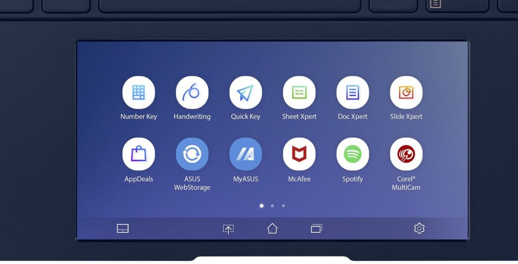 ScreenPad 2 je veľmi dobre navrhnutý a vyriešený systém. Má dve funkcie. Je to bežný čierny touchpad tak, ako ho poznáte z iných notebookov. Dá sa zapnúť do režimu displeja a vtedy na ňom môžete mať okná iných aplikácií. Napríklad si na ňom pustiť nejaké video z YouTube alebo naň umiestniť ovládacie prvky vybranej aplikácie. Zároveň funguje v režime podpory pre aktívny program vo Windows. Napríklad Microsoft Word alebo Excel a vy máte na spodnom displeji časť ovládacích prvkov. Dokonca sa dá nastaviť, aby sa po spustení podporovaných aplikácií displej aktivoval v ich podpornom režime. Aj v tomto režime sa dá použiť ako touchpad. Stlačíte jedno tlačidlo, displej mierne stmavne a bude zatiaľ fungovať v tomto režime. ScreenPad 2 má rozlíšenie 2160 × 1080 px a ide o IPS displej s pozorovacím uhlom až do 178°.