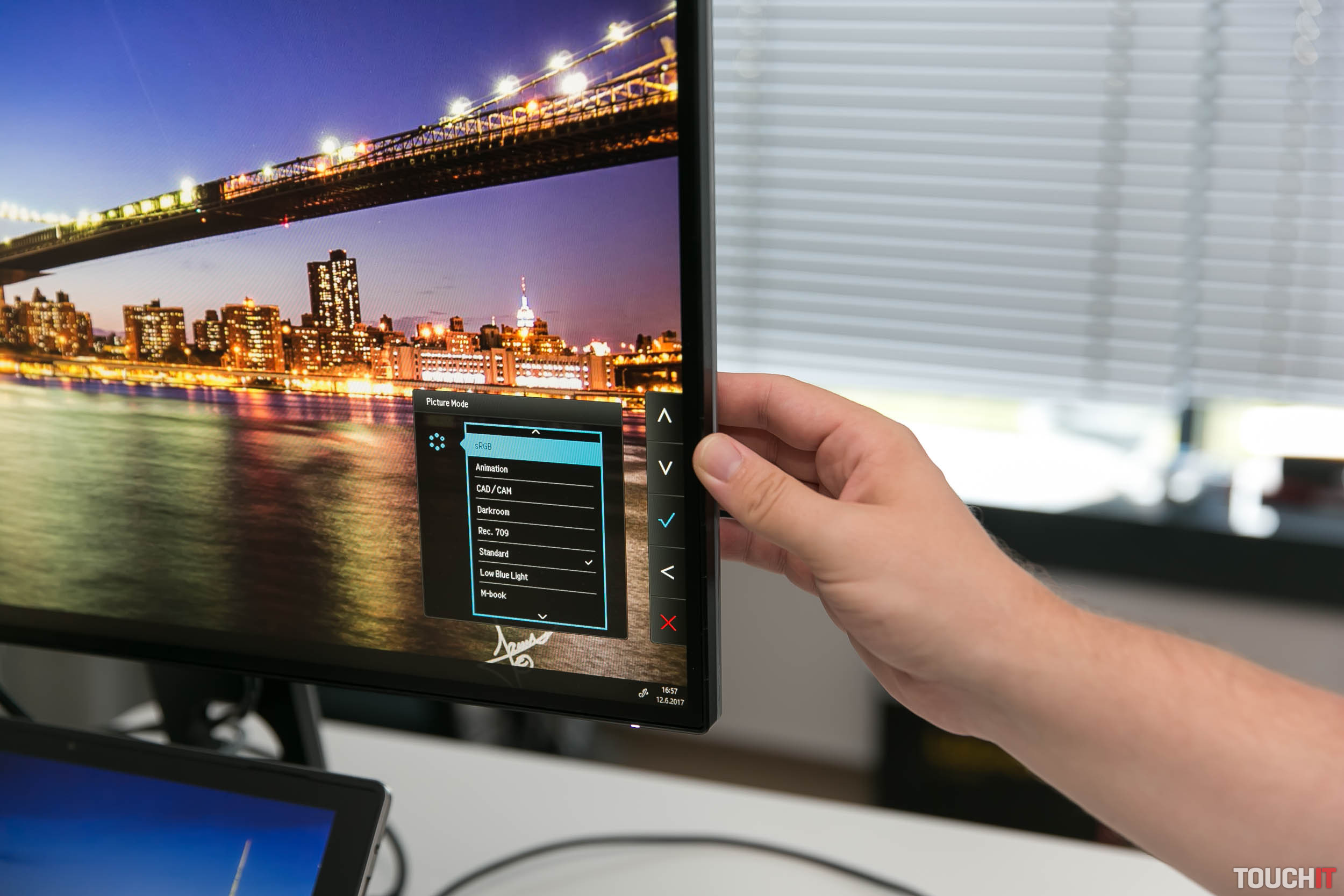 Skvelý základ BenQ PD2710QC vyniká vo vernosti zobrazovania farieb. Tento 27-palcový monitor využíva IPS panel a ponúka rozlíšenie 2560 x 1440. Pokrýva 100 % farebného priestoru sRGB/Rec.709 a má 8-bitovú farebnú hĺbku. Monitor je od výroby kalibrovaný pre spomenuté farebné priestory, čo sme overili aj testovaním. Priemerná odchýlka deltaE dosiahla hodnotu 1, maximálna odchýlka deltaE bola rovná 2. Je to veľmi dobrý výsledok, pričom väčšinu času sa tieto hodnoty držali na vynikajúcich hodnotách 0,9, resp. 1,5. Celkový výsledok však mierne zhoršil tmavý odtieň modrej, ktorý dosiahol spomenutú odchýlku na úrovni 2. Výrobca udáva maximálny jas na úrovni 350 cd/m2, my sme namerali 333 cd/m2. Podsvietenie je rovnomerné. Pozorovacie uhly sú výborné, kontrast je 1000 : 1, pričom monitor ponúka aj funkciu dynamického kontrastu. Vopred nastavené režimy sú taktiež prispôsobené pre pracovné využitie. Okrem režimov sRGB a Rec.709 tak nájdete v ponuke Animation, CAD / CAM, Darkroom, ale aj Low Blue Light, ktorý tlmí vyžarovanie modrého svetla. Režim Animation lepšie zobrazuje detaily v tmavých oblastiach, CAD / CAM vylepšuje kontrast čiar a tvarov na technických dokumentáciách a Darkroom je prispôsobený pre prácu v tmavých miestnostiach. Monitor má takisto tenký rám okolo displeja a praktický dizajn stojana, ktorý umožňuje prispôsobenie výšky, náklonu a natočenia. Takisto obsahuje dieru pre manažment káblov a dá sa používať aj v režime na výšku. V tomto smere ťažko niečo vytknúť.Monitor má štýlový, tenký rámik okolo displeja a viacero režimov, ktoré sú prispôsobené pre prácu